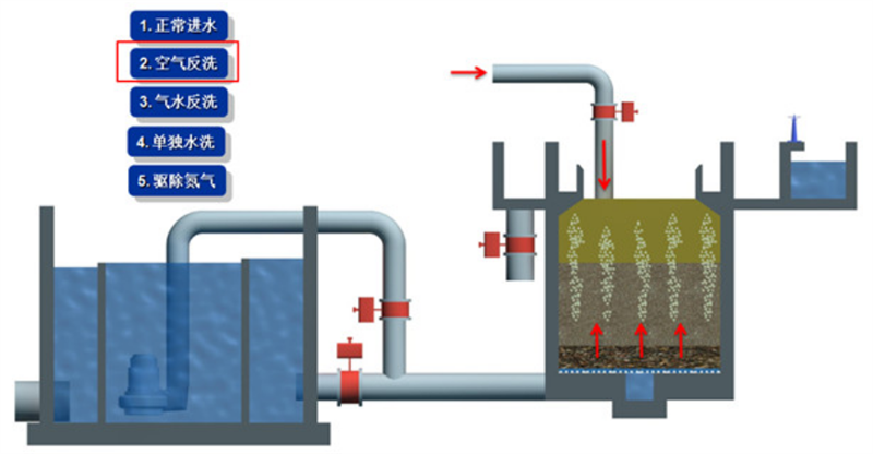 开启反冲洗空气阀,通过底部布气系统向滤料层通入空气,利用空气的搅拌作用,使滤料颗粒相互摩擦、碰撞,松动滤料层,将附着在滤料表面的污泥、老化生物膜初步剥离,此阶段一般持续 3-5 分钟。