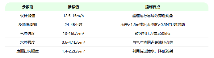 2. 反冲洗过程:在反冲洗时,关闭进水阀,部分进水通过常开的方孔流入滤池,形成表面扫洗。反冲洗分为气冲、气水联冲和水冲三个阶段,确保滤料表面的杂质被有效清除。
